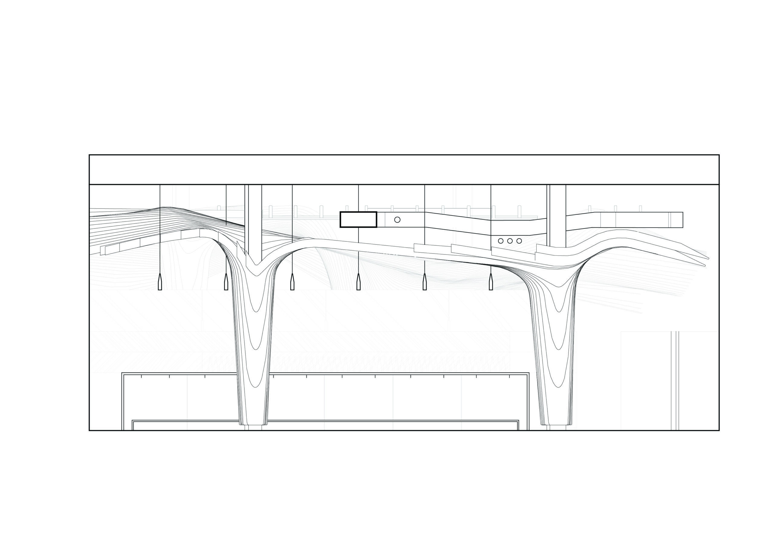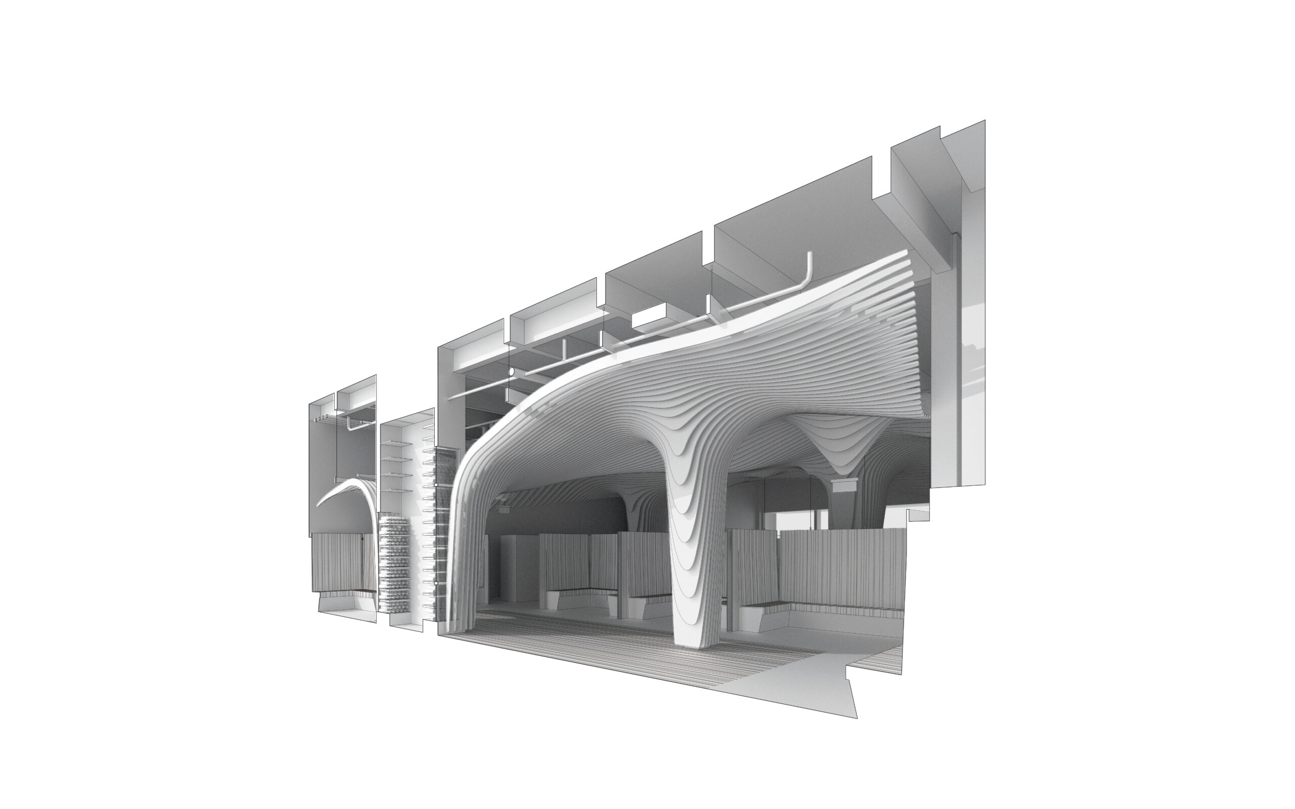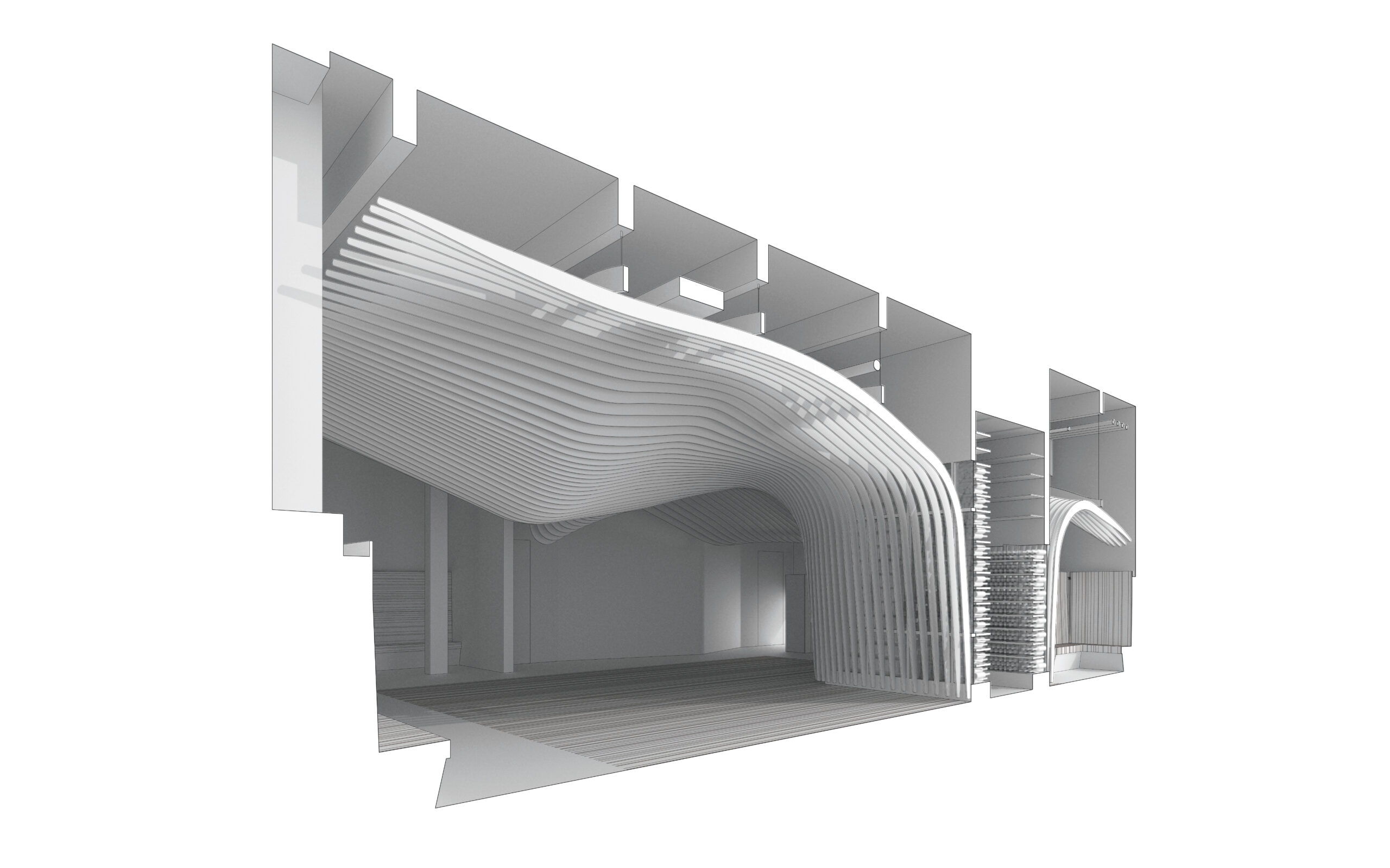 The wood slats are designed as a landscape, undulating in relation to the very equipment they conceal overhead, while encasing the columns in the main hall. The wine storage, in the middle of the hall, serves as another point of support for the ceiling, and acts as a monumental trunk, keeping the canopy aloft. Divided into two segments, the front area on Washington Street is programmed as a bar, while the larger hall behind serves as the dining area. An axial view from the street produces the proscenium from which to view the canopy while lateral views give hints of the structural and mechanical devices being concealed.