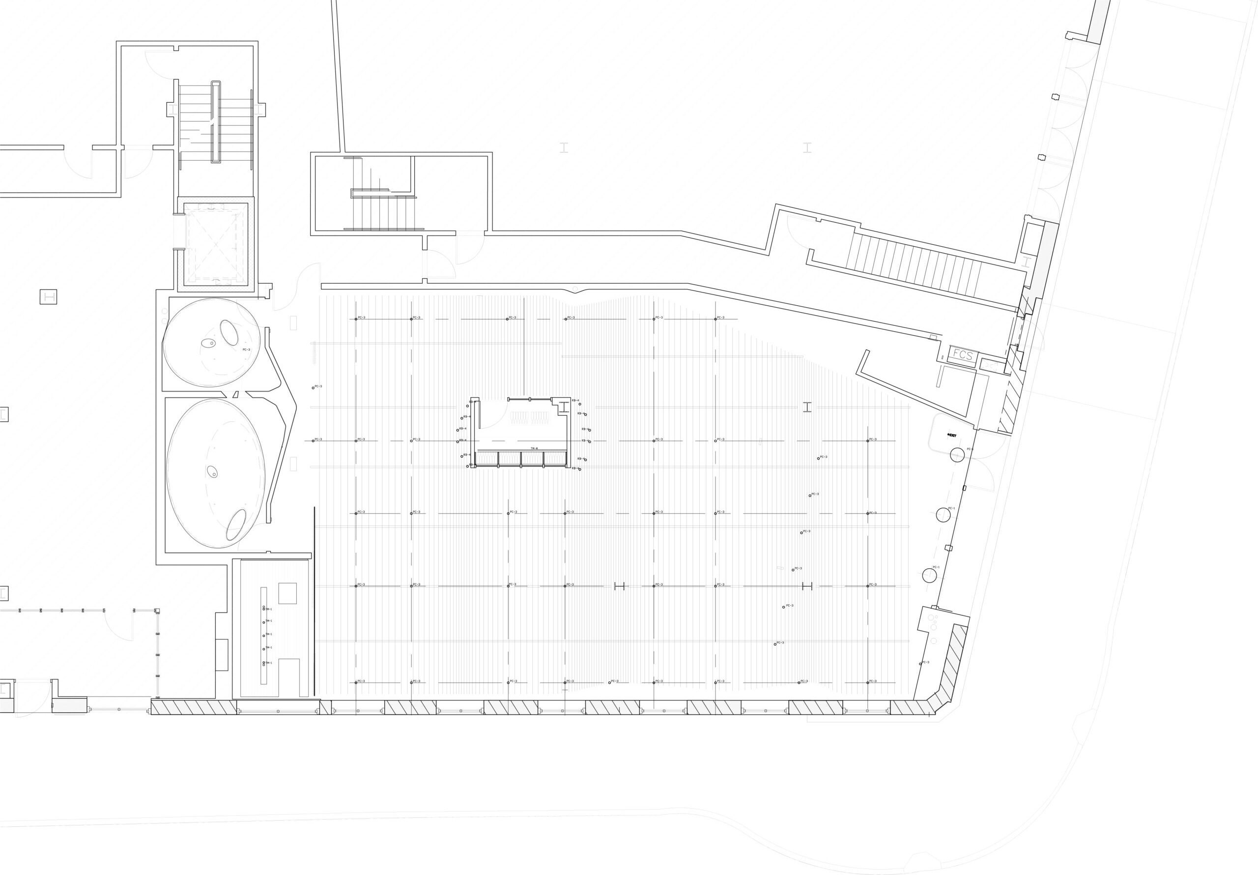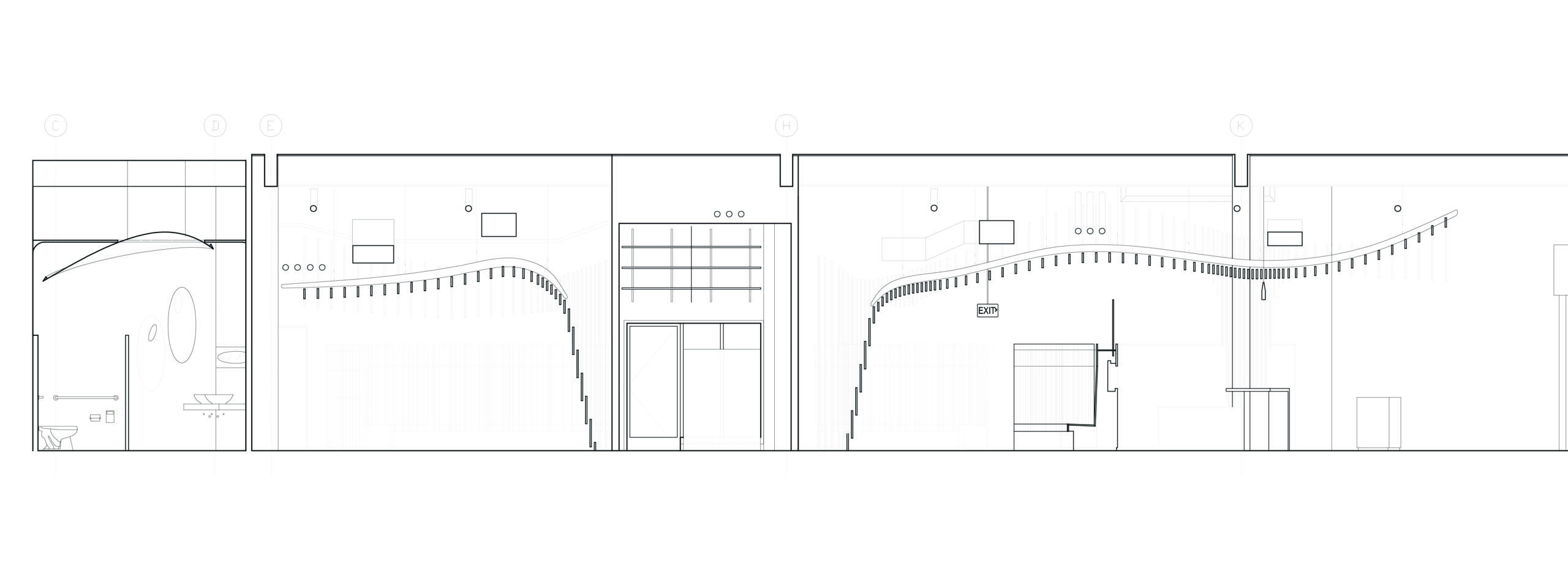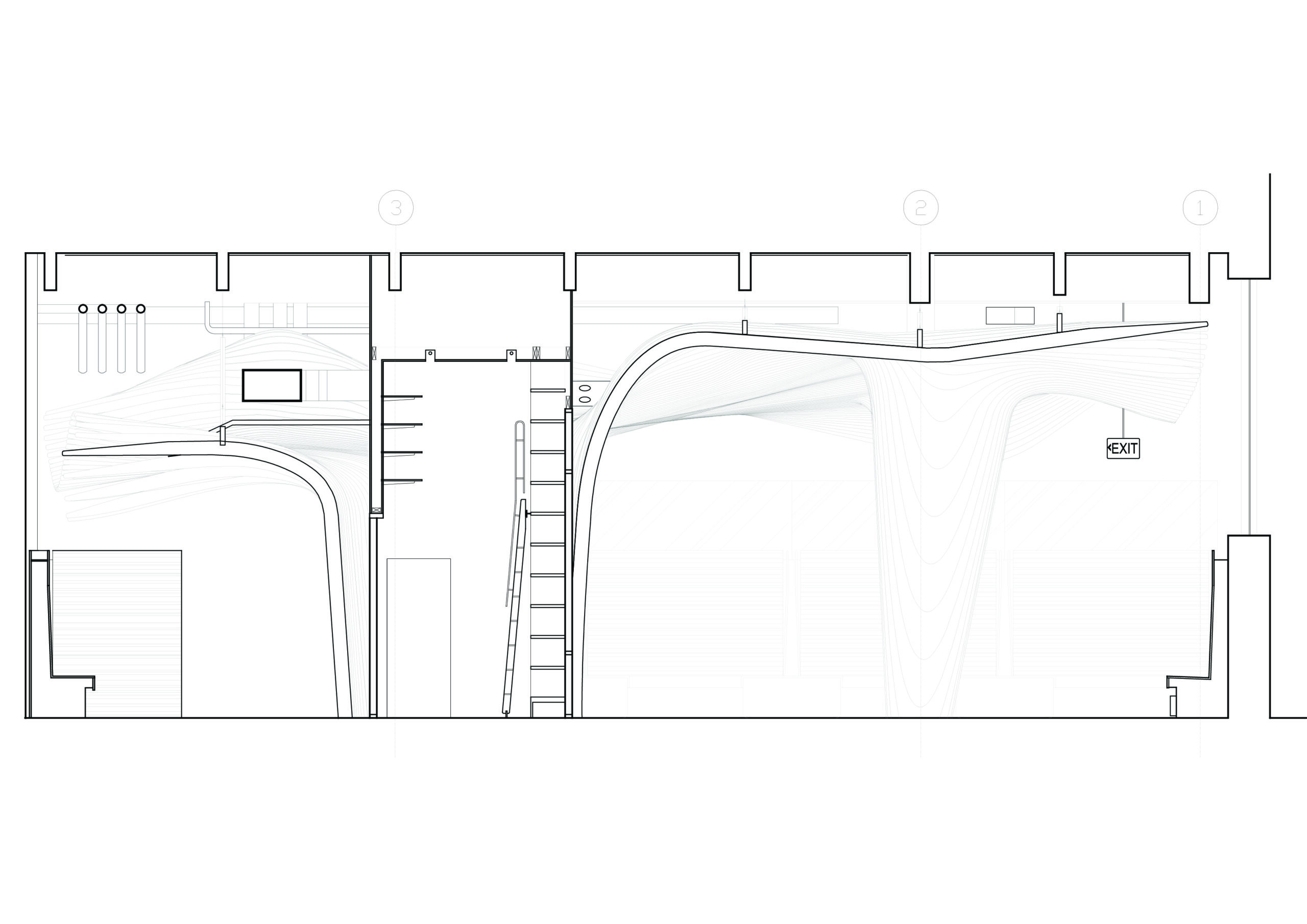 The wood slats are designed as a landscape, undulating in relation to the very equipment they conceal overhead, while encasing the columns in the main hall. The wine storage, in the middle of the hall, serves as another point of support for the ceiling, and acts as a monumental trunk, keeping the canopy aloft. Divided into two segments, the front area on Washington Street is programmed as a bar, while the larger hall behind serves as the dining area. An axial view from the street produces the proscenium from which to view the canopy while lateral views give hints of the structural and mechanical devices being concealed.