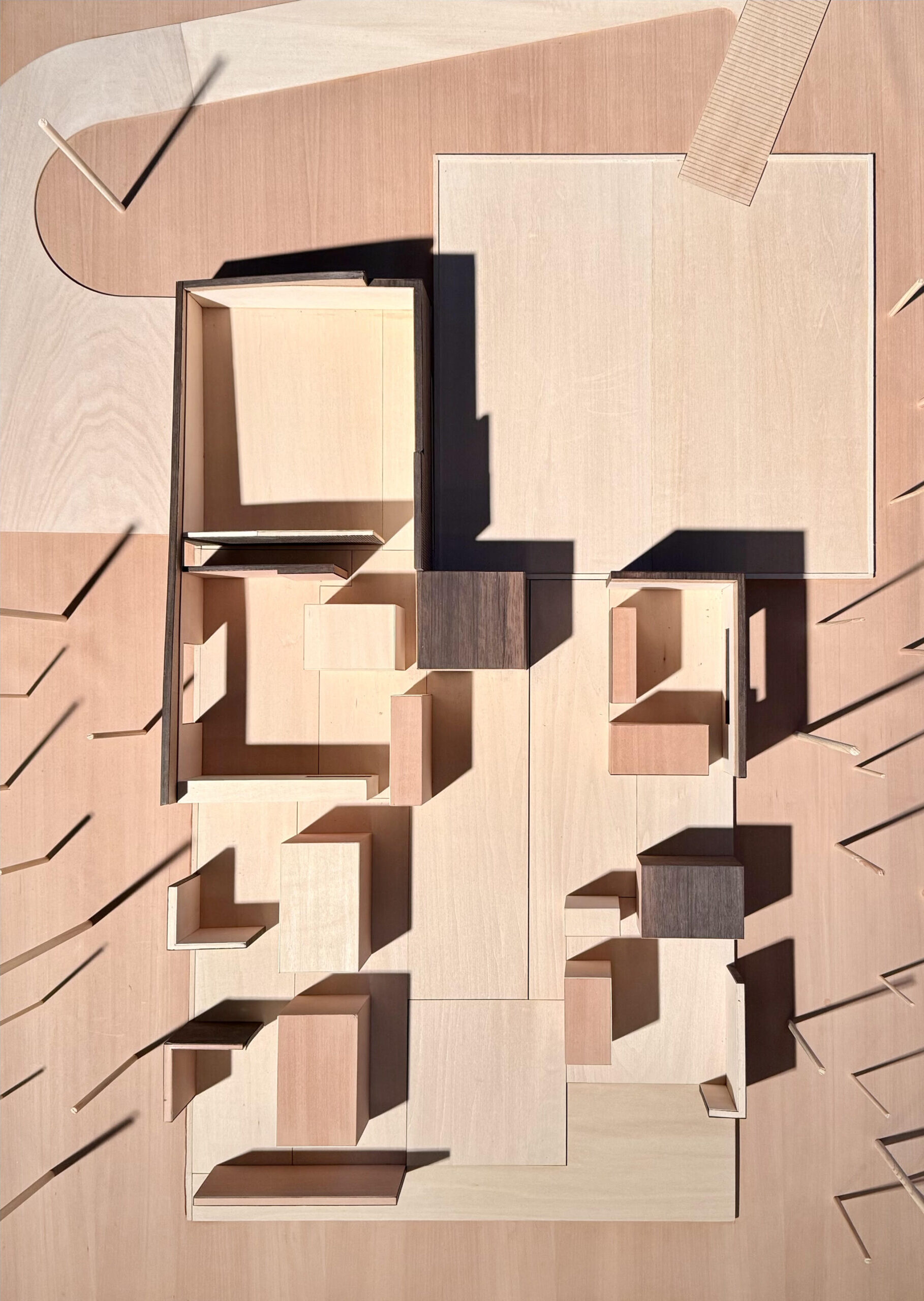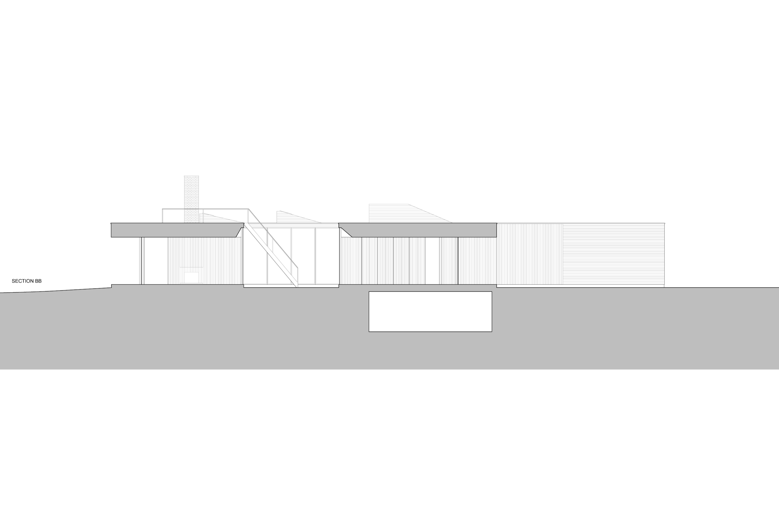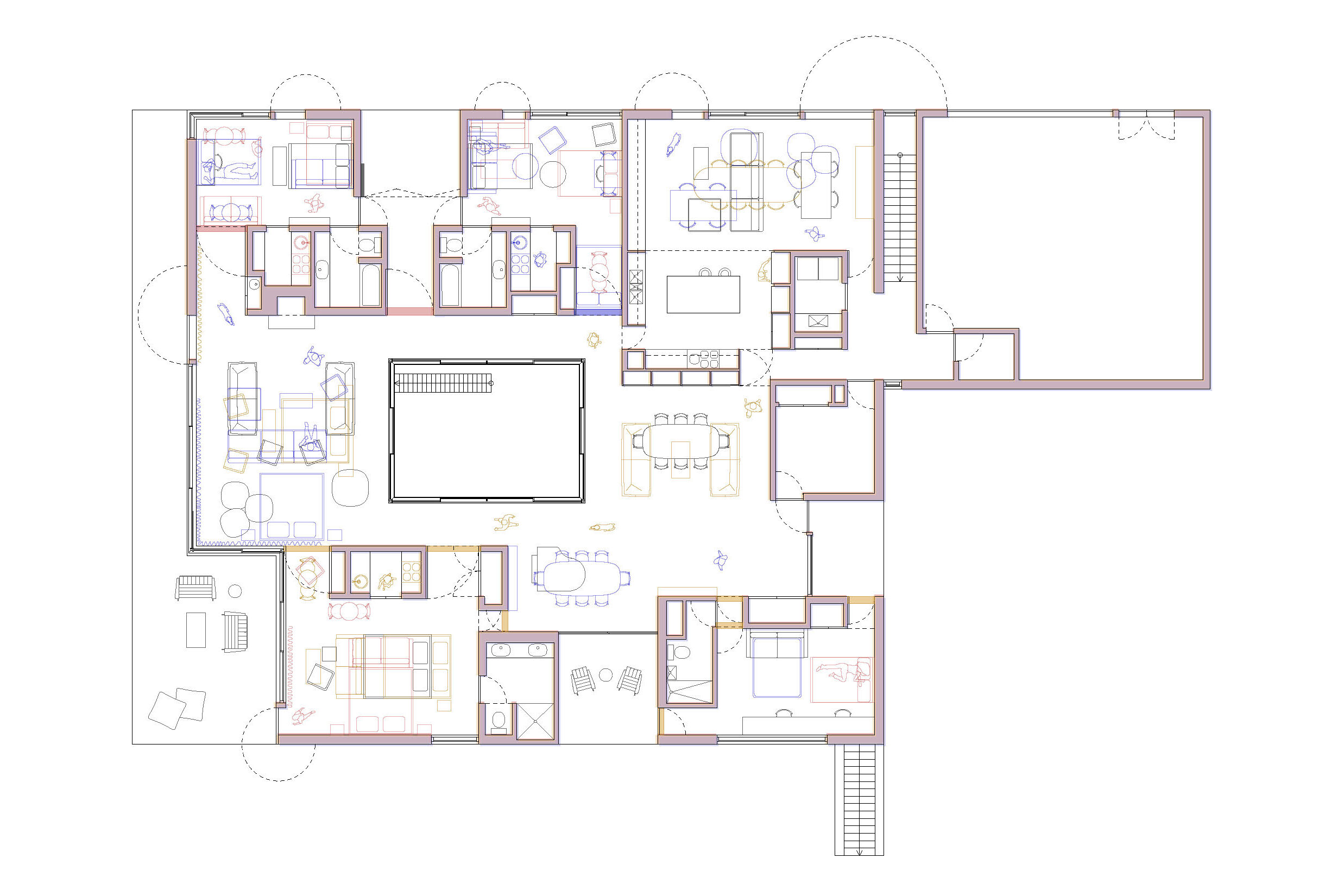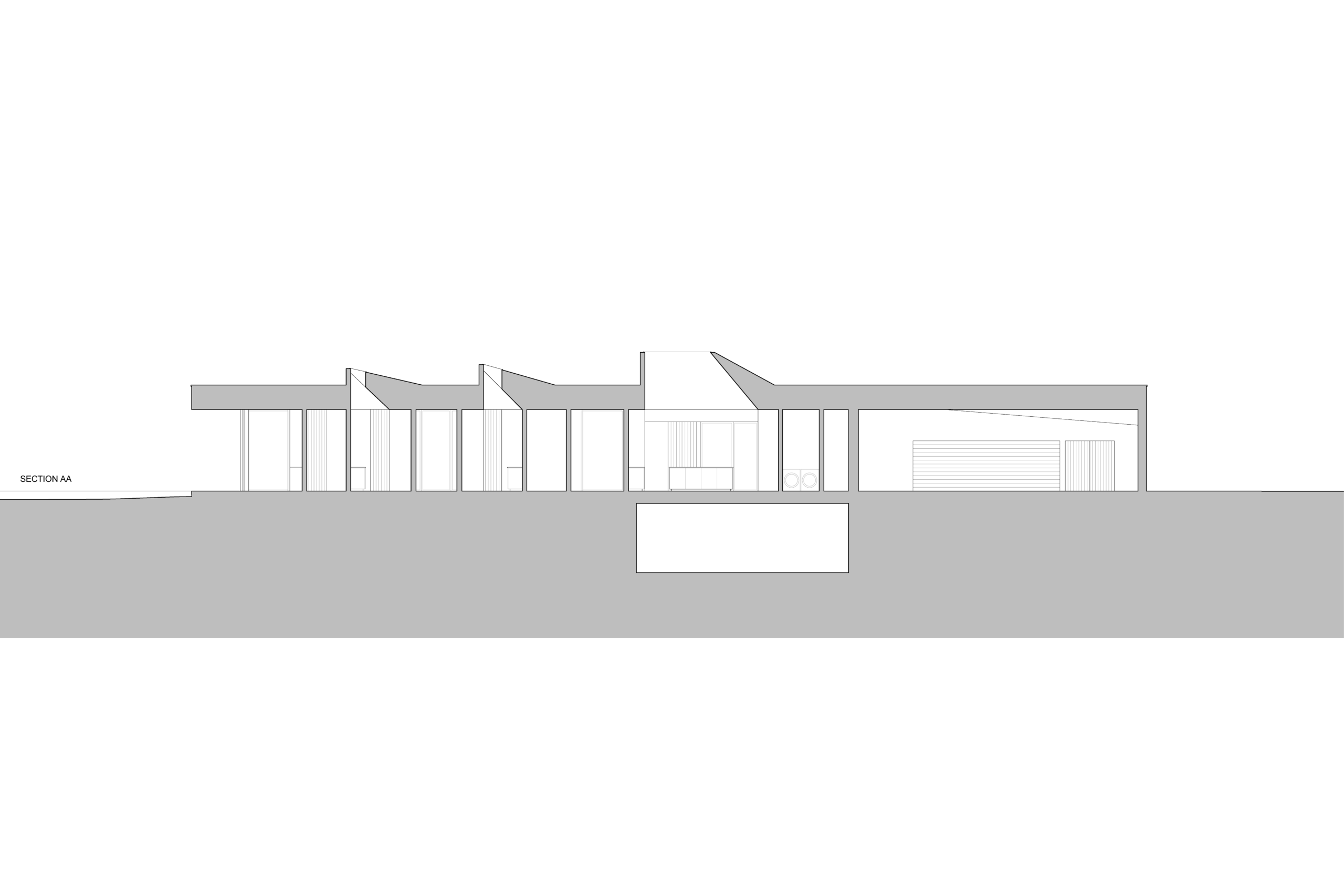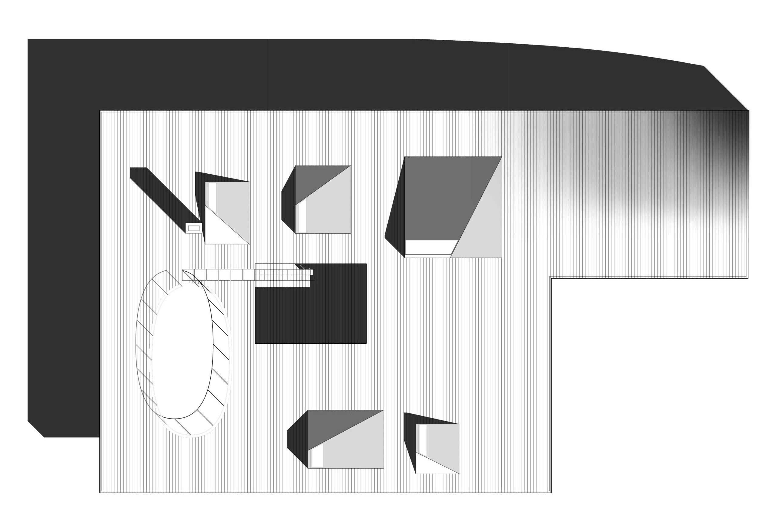 Learning from precedents such as the movable walls in the Schröder House, or the ever-transforming cabinetry in the Maison de Verre, house overtime proposes transforming a home from free plan to poché throughout each day, and from one house to multiple units over the course of its life. Easy to operate, oversized floor-to-ceiling doors are detailed so they blend into the walls; or from another perspective, walls swing or slide in the manner of doors. The distinction between open and closed is purposefully erased. As planes move they change how spaces are defined, oscillating from open space to a cellular configuration. The bathroom cores are designed with permanency in mind, as the house changes around them. Not unlike Mies’ Farnsworth House, these are immovable solid volumes where privacy is paramount. Removed from the perimeter these volumes penetrate through the ceiling seeking light, forming permanent imprints into the otherwise flat plane of the green roof garden.